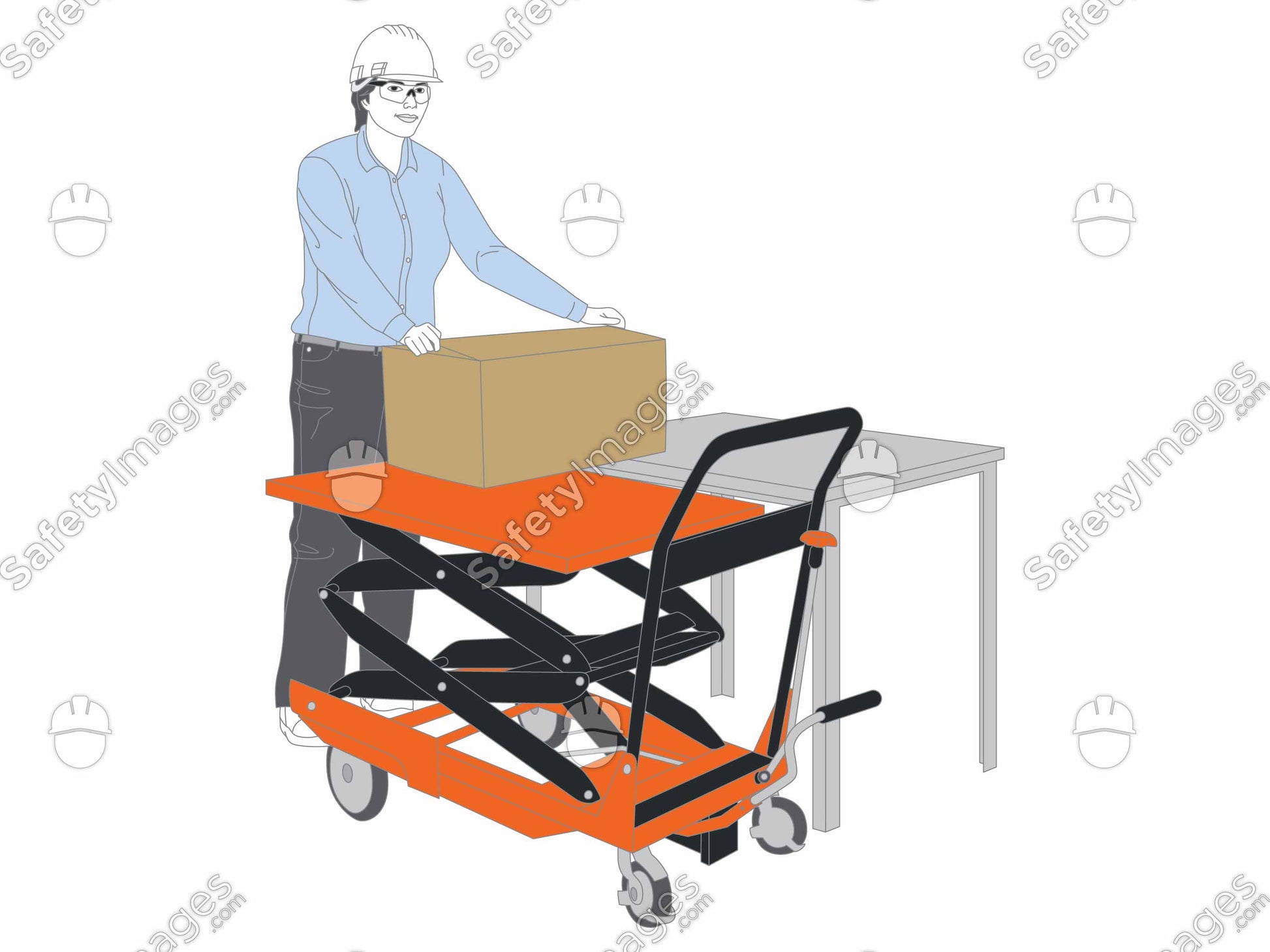Illustration of a lady wearing a hard hat using a scissor lift trolley to transfer a heavy box from the trolley to a table, without having to lift the whole weight of the box.